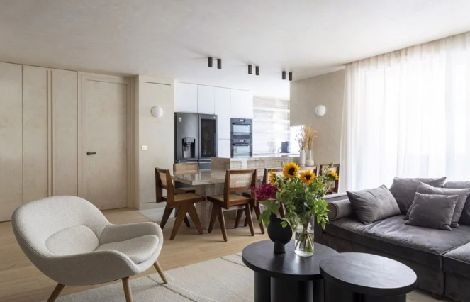 Ce salon ouvert sur la salle à manger offre un espace de vie fluide et chaleureux, pensé pour le confort et la convivialité. Les volumes généreux et la circulation naturelle de la lumière créent une atmosphère accueillante, idéale pour partager des moments en famille ou recevoir. Les matières soigneusement sélectionnées et les teintes douces apportent une élégance intemporelle à l’ensemble.